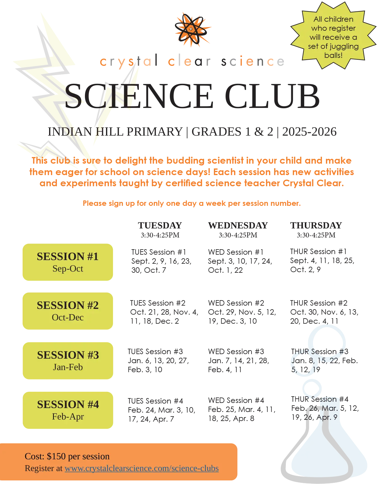 Each science club session is created and taught by certified teachers. Not only do kids do fun experiments but they learn how to ask questions and look for answers on their own. Classes are designed to give kids a taste of the many branches of science from chemistry to botany, from rainbows to reptiles!