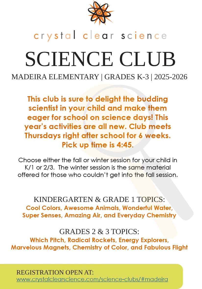 These hands-on, minds-on activities and experiments will have your child eager for school on science days. Science club classes are developed by Michelle White aka Crystal Clear; owner and certified science teacher with 30+ years of teaching experience. PLEASE USE YOUR SCHOOL’S TAB & CHECK DATES AND SCHOOL CAREFULLY BEFORE REGISTERING. REFUNDS NOT AVAILABLE AFTER REGISTRATION RECEIVED. THANK YOU FOR YOUR INTEREST!